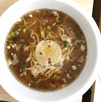 開封するとノンフライ麺の独特感があります。焦がしねぎのこうばしい香りがいい、しょうゆスープに焦がしねぎの味がミックスされ(すっぱ味が出ます)とてもおいしいですが、麺に絡まないのがいま一つと生麺タイプ独特の粉っぽさが感じられます。スープがおいしいのに残念です。